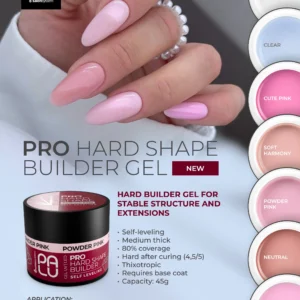 Ko se Pro Hard Shape strdi, postane opazno trd in stabilen (4,5/5), kar ustvari trdno ogrodje za nohte. Je odlična izbira za strukture, ki zahtevajo trdnost – tako kratke kot dolge podaljške na oblikah in dvojnih oblikah. Primeren je tudi za zapolnjevanje in krepitev naravnih nohtnih plošč.