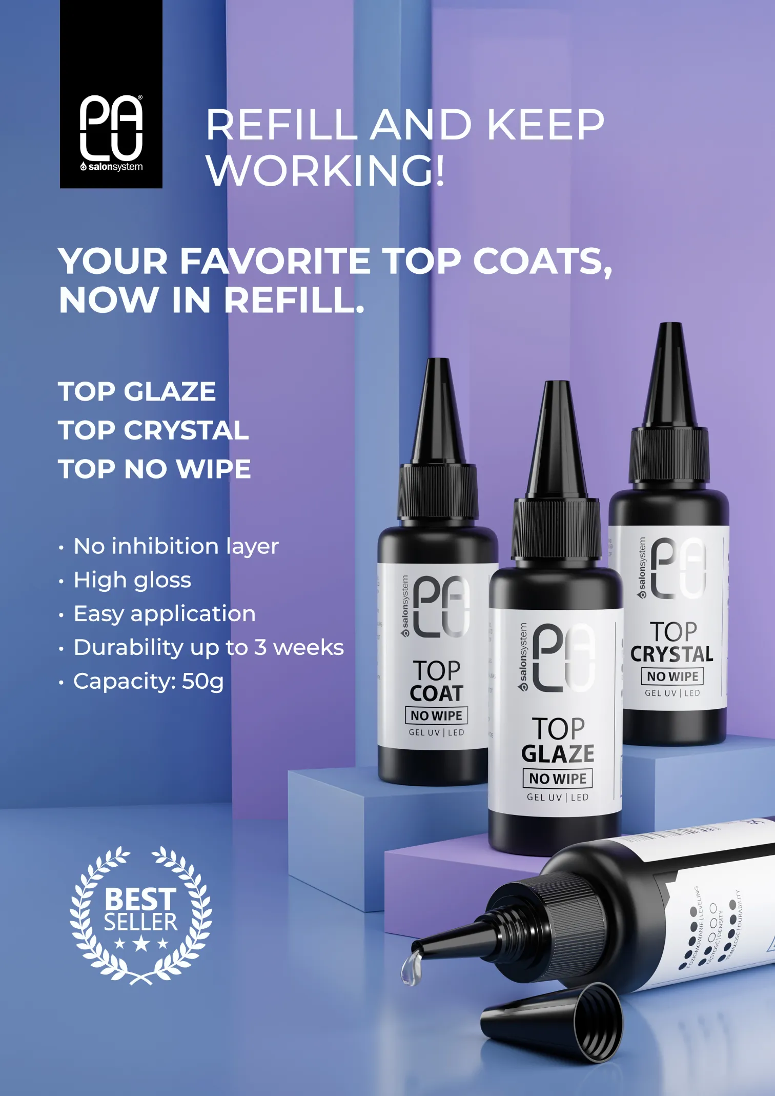 Palu Top Crystal No Wipe zagotavlja intenziven sijaj in učinek “mokrih nohtov”, hkrati pa poudarja globino barve – še posebej pri temnih pričeskah.